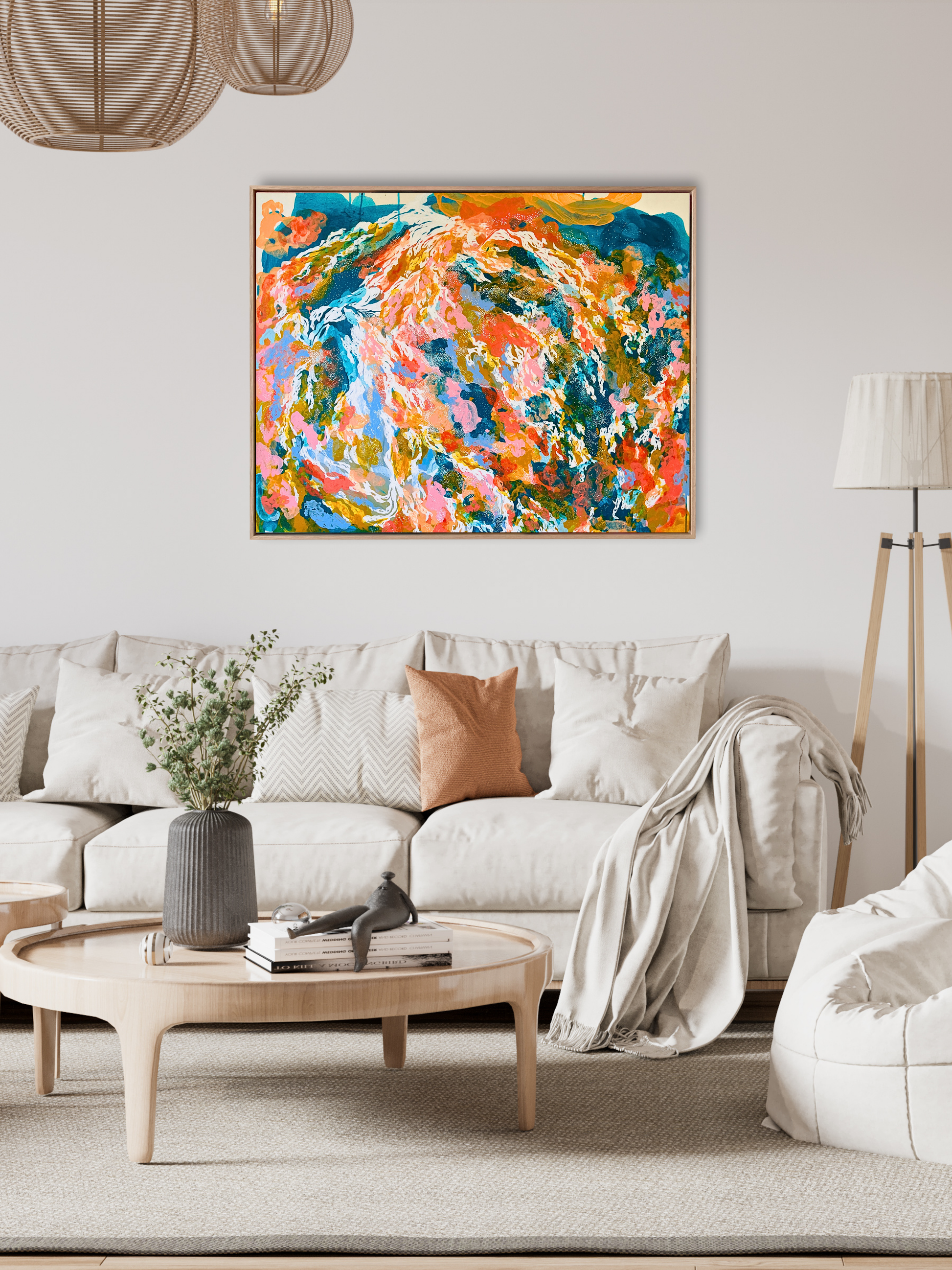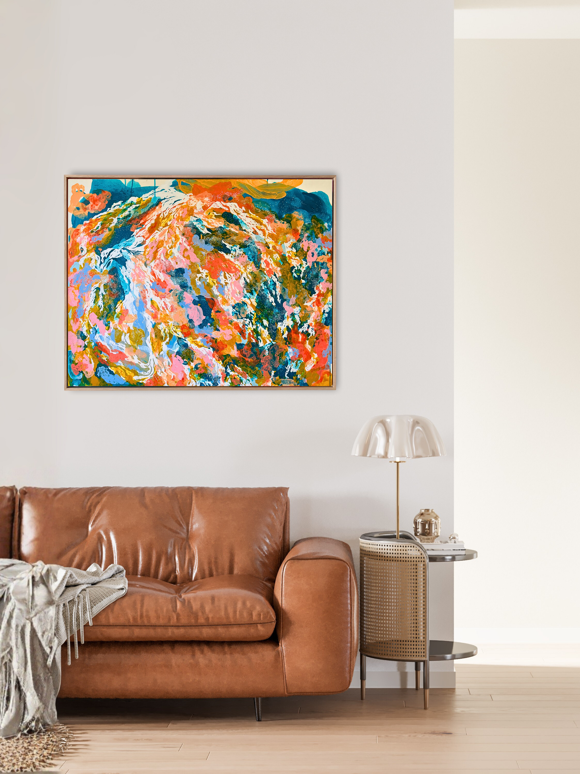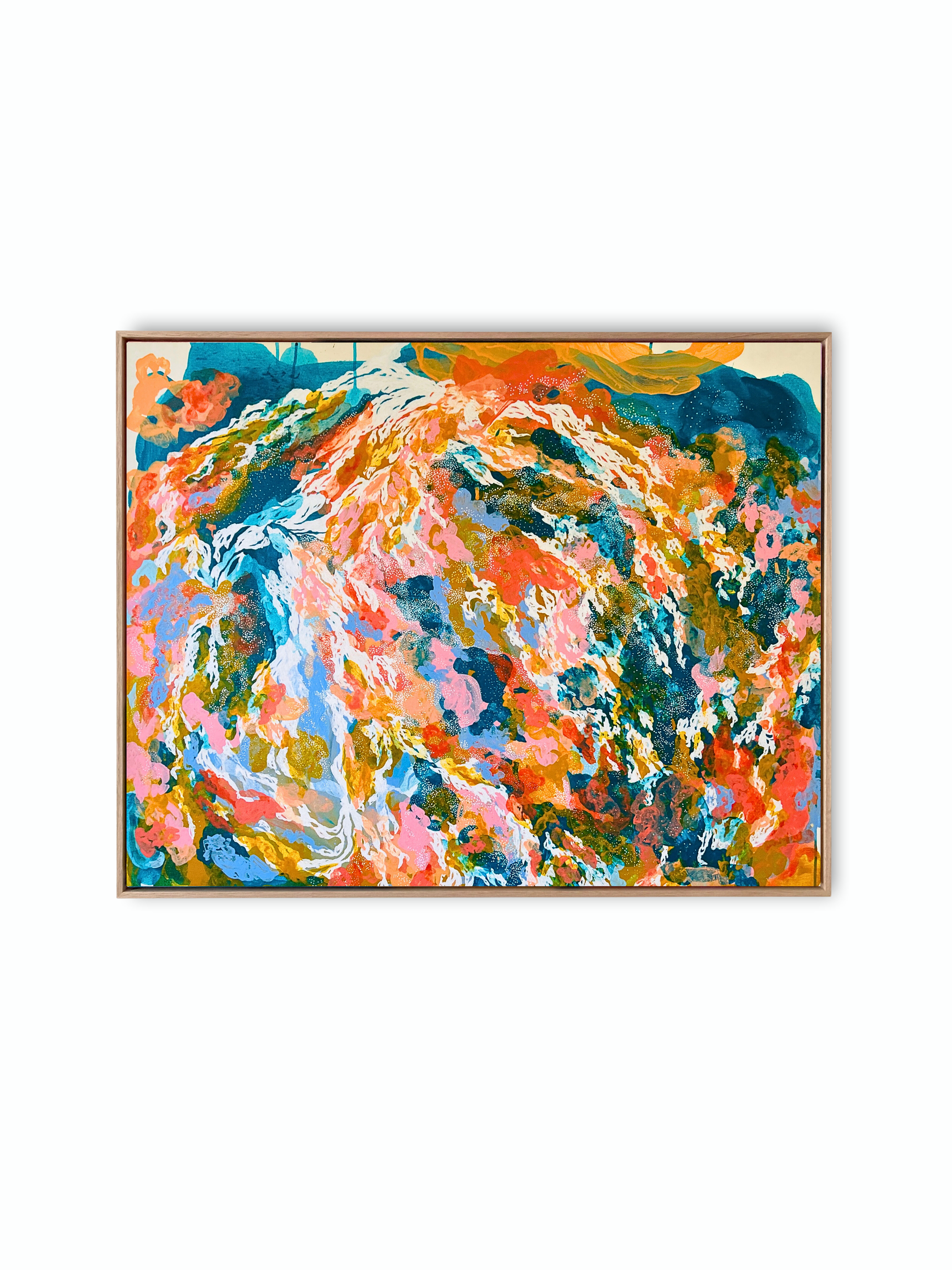 Esta obra nace en la frontera donde la emoción se vuelve paisaje. Azules profundos y tonos celestes en movimiento sostienen una trama de gestos blancos y destellos coral que se expanden como mareas vivas, como corrientes que no responden a mapas sino a pulsaciones internas.
